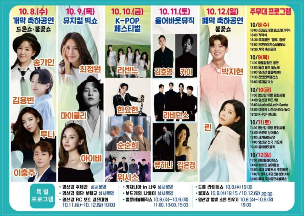 5일간의 축제를 마무리하는 폐막공연에서는 린, 박지현 등이 출연해 감미로운 무대를 선보이며, 마지막 밤에는 화려한 불꽃 퍼포먼스와 함께 ‘영산강의 밤’을 완성합니다.